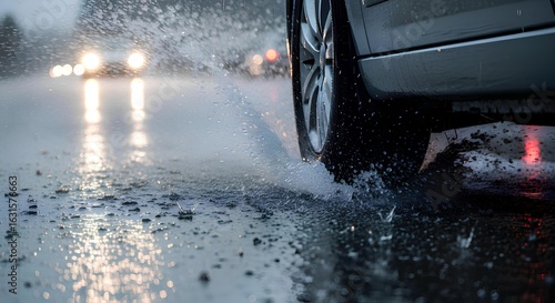 rain, night, street, car, water, road, puddle, splashing, wet, driving, traffic, light, city, urban, dark, vehicle, speed, rainy, storm, wetness, illumination, motion, blur, transportation, environment, weather, damp, splash, drizzle, cloudburst