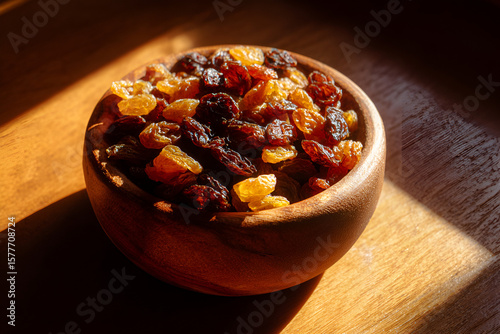 Raisins in Wooden Bowl on Table with Sunlight Creating Strong Shadows