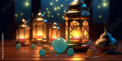 Ramadan festival lantern and props on the floor background. Culture and religion concept. Digital art illustration