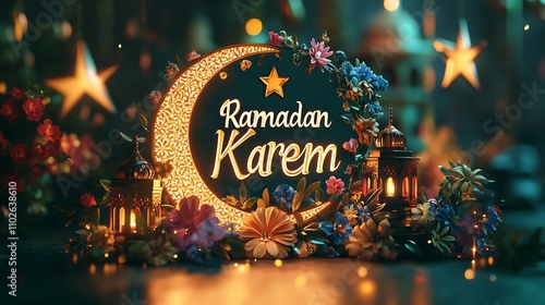 ramadan, crescent, moon, floral, flower, design, lantern, lamp, light, bokeh, star, star, gold, gold, illuminated, glow, night, dark, background, festive, celebration, islamic, muslim, religion, faith, tradition, culture, holiday, ornate, elegant, beautiful, colourful, vibrant, peace, spirituality, blessing, hope, serenity, joy, happiness, warmth
