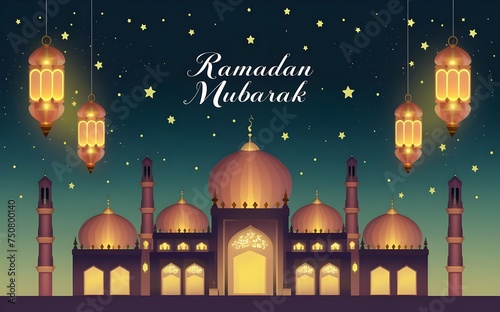 Ramadan Mubarak Islamic Festival Eid Mubarak background, Mosque At Night Ramadan Illustration, Muslim Holiday Ramadan Celebration