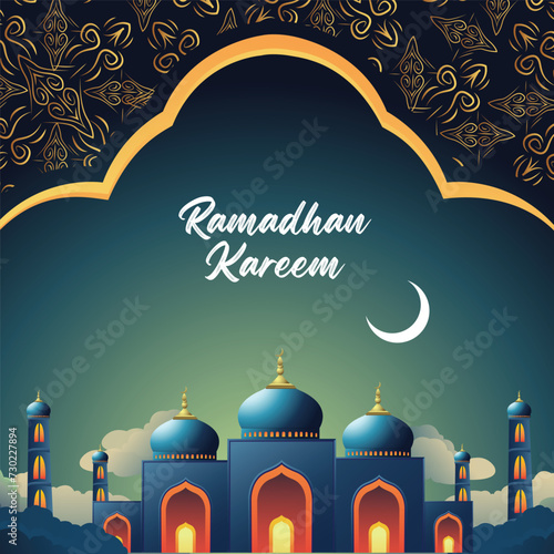 Ramadhan Kareem, poster for greeting with mosque ornaments, paper cut clouds, Islamic patterns