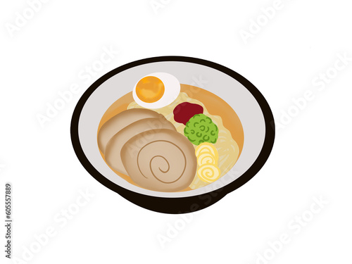 Ramen, a dish made with noodles and toppings. with delicious soup beautifully decorated in a cup on a white background.