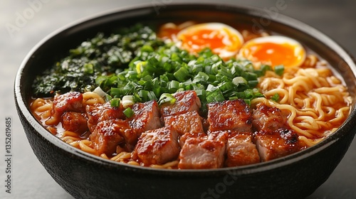 Ramen bowl sliced pork egg noodles green onions isolated on a plain white background detailed Japanese fast food concept