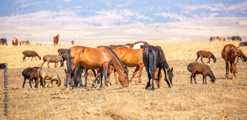 Rams and lambs graze in a meadow. Cattle grazing. A flock of rams walks across an autumn field in search of grass. sheep