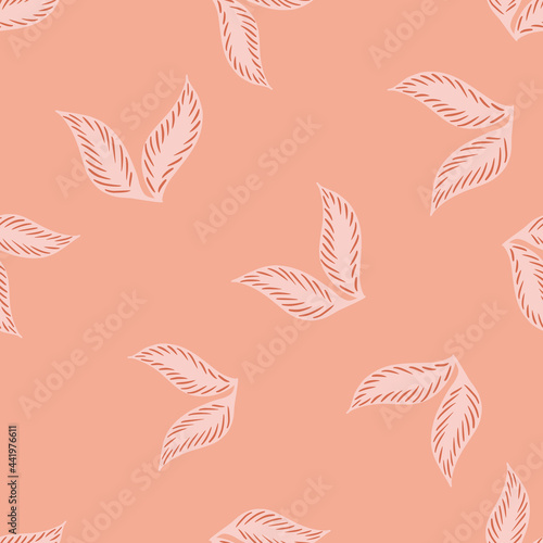 Random seamless pattern with botanic leaf ornament. Pink pastel background. Organic foliage silhouettes.