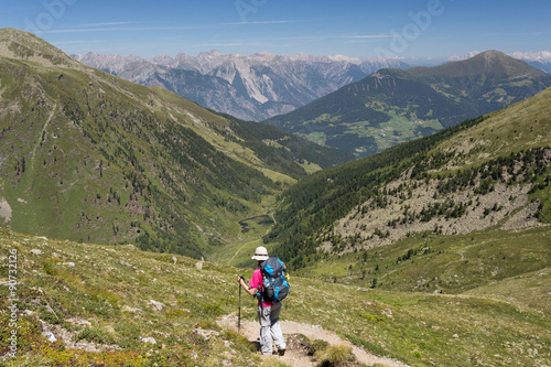 hiker, hiker, path, vale, panorama, mountain, peak, vertex, descent, lea, meadow, pasture, hike, walk, sport, austria, tyrol, alps, alt, ridge, crest, posture, trek, vacation, summer