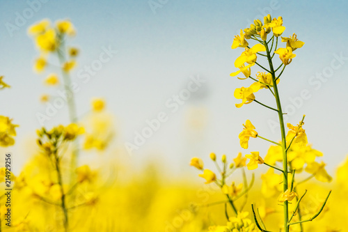 Rape blossom. Spring background. Flowering Canola or colza. blooming rape or Brassica napus. Springtime and summer border