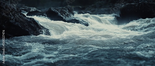 Rapid water cascades over dark rocks, capturing the power and raw beauty of nature's wilderness in a dynamic and mesmerizing scene.