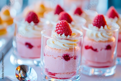 dessert, raspberry, glasses, topping, cream, serving, food, sweet, berry, pink, table, spoon, layer, catering, arrangement, closeup, small, presentation, epicure, tasting, fresh, dish, refreshment, treat, indulgence, party, celebration, event, style, delicious, mini, portion, sugar, fruit, cookery, eatery, snack, buffet, luxury