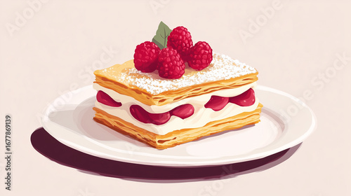 mille-feuille, raspberry, pastry, dessert, cake, cream, puff pastry, plate, mille-feuille, mille-feuille, sweet, food, delicious, bakery, baked, fresh, layer, layered, confectionery, treat, sugar, powdered sugar, cookery, french, tasty, epicure, homemade, eatery, cafes, table, background, white, pink, shadow, drawing, illustration, digital artwork, clip art, isolated, closeup, macro, still life, dish, meal