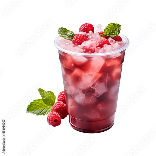 Raspberry mint iced drink in plastic cup isolated on transparent background