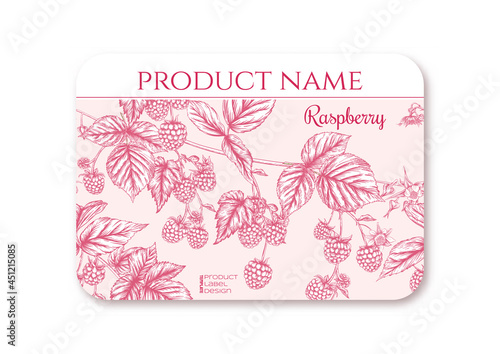 Raspberry. Ripe berries on branch. Template for product label, cosmetic packaging. Easy to edit. Graphic drawing, engraving style. Vector illustration..