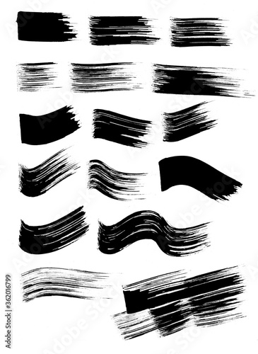 Raster set of texture brush strokes hand drawn in black ink with a wide brush. Raster collection of traced black wide brushes on a white background.