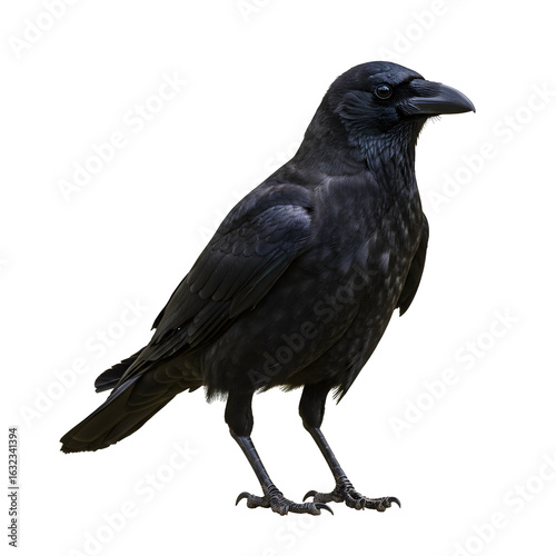raven, standing, watching, bird, animal, looking, studio, isolated, wildlife, feather, glossy, black, dark, ominous, mysterious, portrait, closeup, detailed, full body, observant, alert, beak, eye, profile, wild, nature, wild bird, perched, avian, feathered, half face, symbolic, one animal, monochrome, ornithology, zoology
