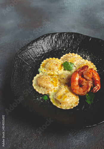 ravioli with shrimp, in cream sauce, with spices and herbs, top view, no people,