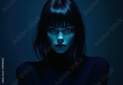 Raw and Minimal: Portrait of a Young Woman in Darkness with Black Hair and Turtleneck