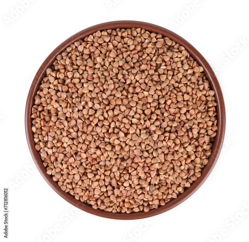 Raw buckwheat in bowl isolated on white, top view