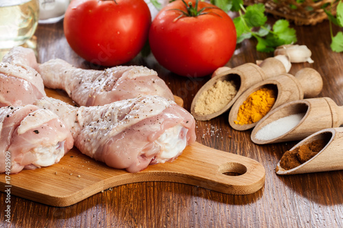 chicken, raw, meat, leg, board, uncooked, food, cooking, table, pepper, ingredient, background, fresh, wooden, coriander, turmeric, ginger, salt, spice, white, cutting, preparation, meal, garlic, thigh, poultry, nobody