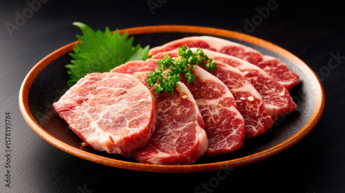 Raw marbled beef slices arranged on a plate with green garnish, ready for cooking or grilling.
