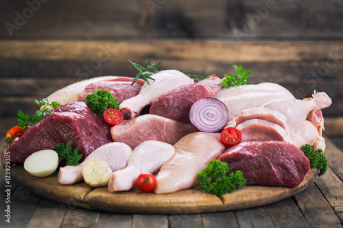 meat, raw, beef, pork meat, chicken, steak, food, fillet, chop, uncooked, butchering, butcher, collection, assortment, fresh, shop, ingredient, roast, red, cutting, cut, board, dinner, nourishment, cookery, parsley, garlic, pepper, tomatoes, onion, epicure, freshness, cooking, protein, wooden, background