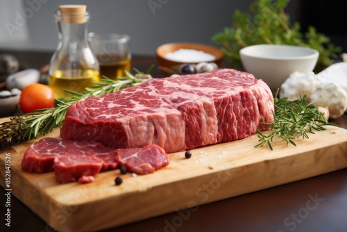 raw sliced meat and vegetables and herbs on a wooden board, delicious food