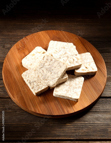 Raw tempeh or tempe on a wooden cutting board, isolated against a wooden background