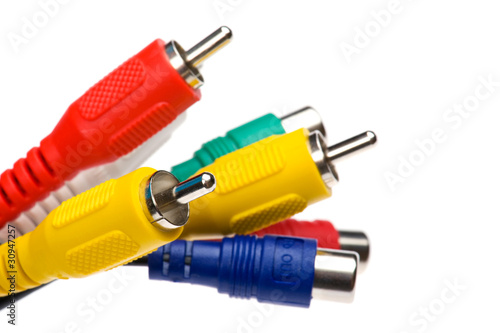 bunch, cable, chrome, coaxial, component, connect, connection, connector, cord, electric, electrical, electronic, equipment, industry, input, isolated, jack, line, macro, metal, outlet, sharp, technology, white