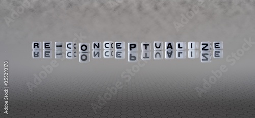 re conceptualize concept represented by black and white letter cubes on a grey horizon background stretching to infinity