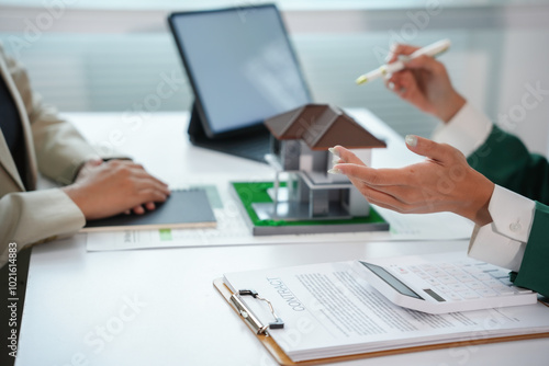 real, estate, house, model, home, agent, client, meeting, contract, offer, purchase, property, investment, buy, sell, mortgage, business, finance, insurance, broker, realtor, apartment, residential, new, sale, rent, ownership, agreements, document, signing, discussion, negotiation, advice, adviser, professional, service, desk, office, paperwork, calculating machine, tablet, laptop, technology, modern, interior, window, light, bright, asian