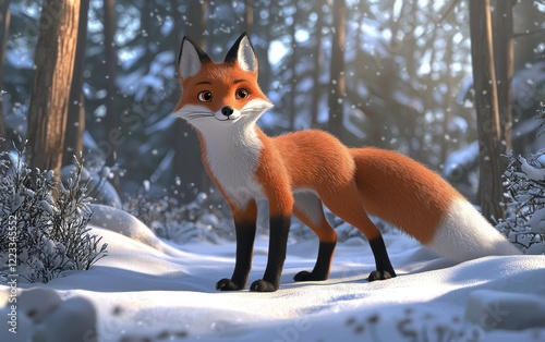 Realistic 3D icon cartoon of a fox with a fluffy tail, standing in a snowy forest