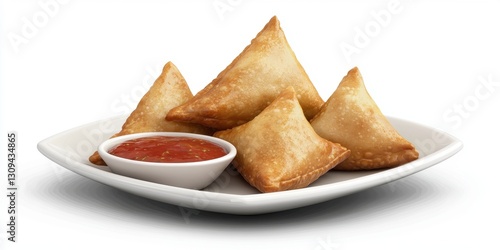 Realistic 3D Icon Cartoon of A Plate of Freshly Made Samosas with Chutney on a White Background