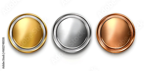 realistic, illustration, medal, gold, silver, bronze, blank, first, second, third, place, isolated, white, background, badge, emblem, design, render, shiny, metal, award, victory, winner, champion, competition, ceremony, achievement, success, celebration, trophy, shape, object, detail, luxury, prestige, art, graphic, symbol, element, creation, visual, image, texture, surface, light, shadow, perspective, style