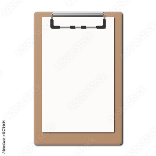 Realistic clipboard folder with blank white sheet of paper. Vector illustration.