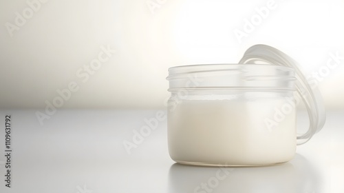 Realistic display of coconut oil in a glass jar on a white background, emphasizing its clear, viscous texture