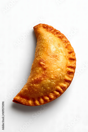 Realistic food photo of a single golden-brown empanada with classic repulgue on white