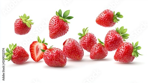 Realistic illustration of fresh red strawberries cascading against a pristine white backdrop, perfect for culinary themes or health-related designs. Captivating and colorful