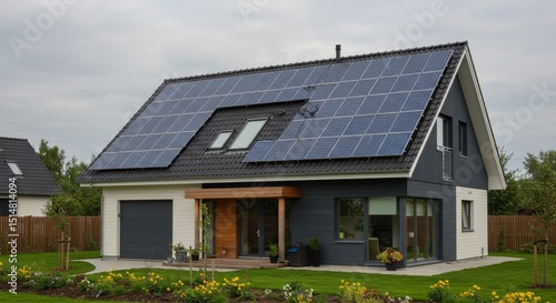Realistic Image Modern House with Solar Panels for Renewable Energy