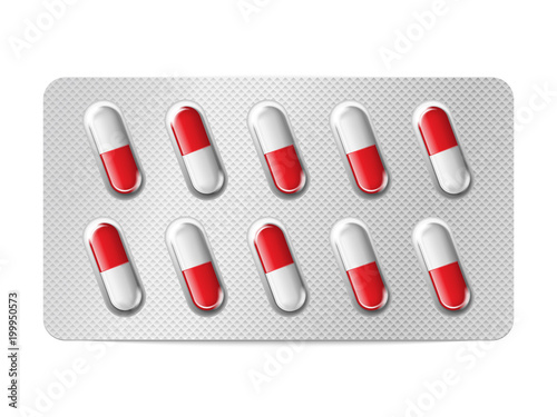 Realistic pills blister with capsules on white background. Realistic mock-up of pills packaging medicines, tablets, capsules, drug of painkillers, antibiotics, vitamins. Healthcare medical.