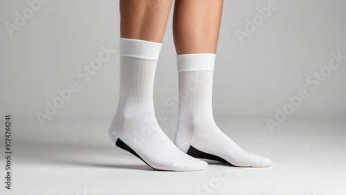 Realistic socks mockup featuring a classic crew length design. Ideal for showcasing apparel designs or branding projects. Clean and minimal, perfect for product presentations
