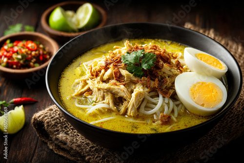 realistic steaming bowl of soto ayam Lamongan, yellow turmeric broth, shredded chicken, vermicelli, hard-boiled egg, fried shallots, side of sambal and lime