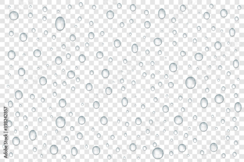 Realistic vector water drops on trasparent background. Rain drops on a surface. Condensation or vapor.
