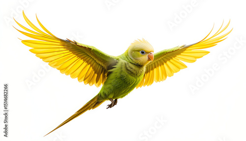 Realistic Yellow Budgie Bird in Flight – Detailed Illustration with Intricate Feathers, Soft Background, Depth of Field, High Quality 4K image