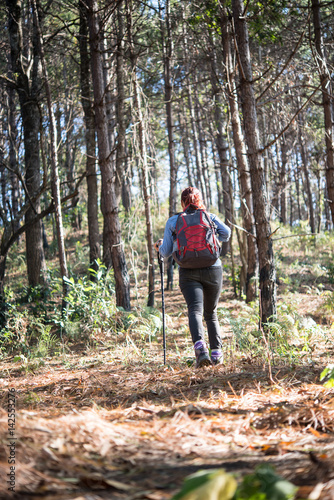 Rear of women hiking traveler with backpack walking through a pine tree forest.