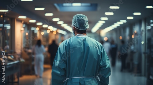 Rear view of a surgeon wearing a sterile gown or surgical gown while walking in the operating room.,Surgeon or doctor wearing protective clothing walking towards operating room in hospital.