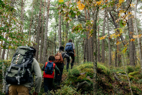 african ethnicity, biracial, day, europa, family, photo, recreational pursuit, four people, color image, togetherness, walking, horizontal, healthy lifestyle, autumn, in a row, lifestyle, mother, nature, father, boy, travel, backpack, vacation, scandinavia, forest, timberland, son, sweden, tree, moving up, exploration, outdoors, hiking, adventure
