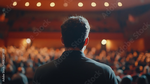 Rear view of people in audience at the conference hall, Speaker giving a talk in conference hall at business event.