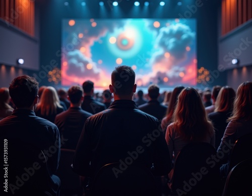 Rear view of people in audience at the conference hall Speaker giving a talk in conference hall at business event dreamlike imagery subconscious exploration bending reality imaginative narrative