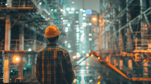 engineer, night time, hard hat, industry, men at work, construction, infrastructure, manufacturing, engineering, contemplative, machinery, plant, factory, oversight, blue-collar, job site