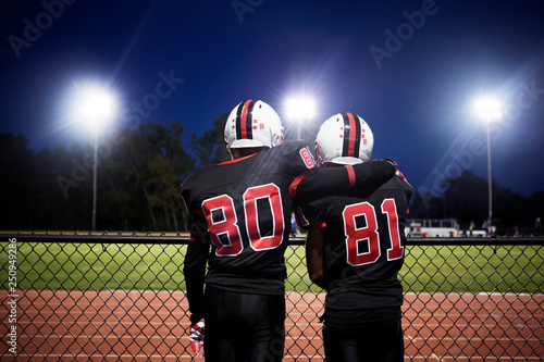 player, man, adult, racked, back, soccer, chain link, fence, field, grass, marking, light, illuminated, sky, night, lifestyle, togetherness, sport, bond, uniform, number, helmet, safety, protection, outdoors, 2, pair, people, new york city, new york city, us, us
